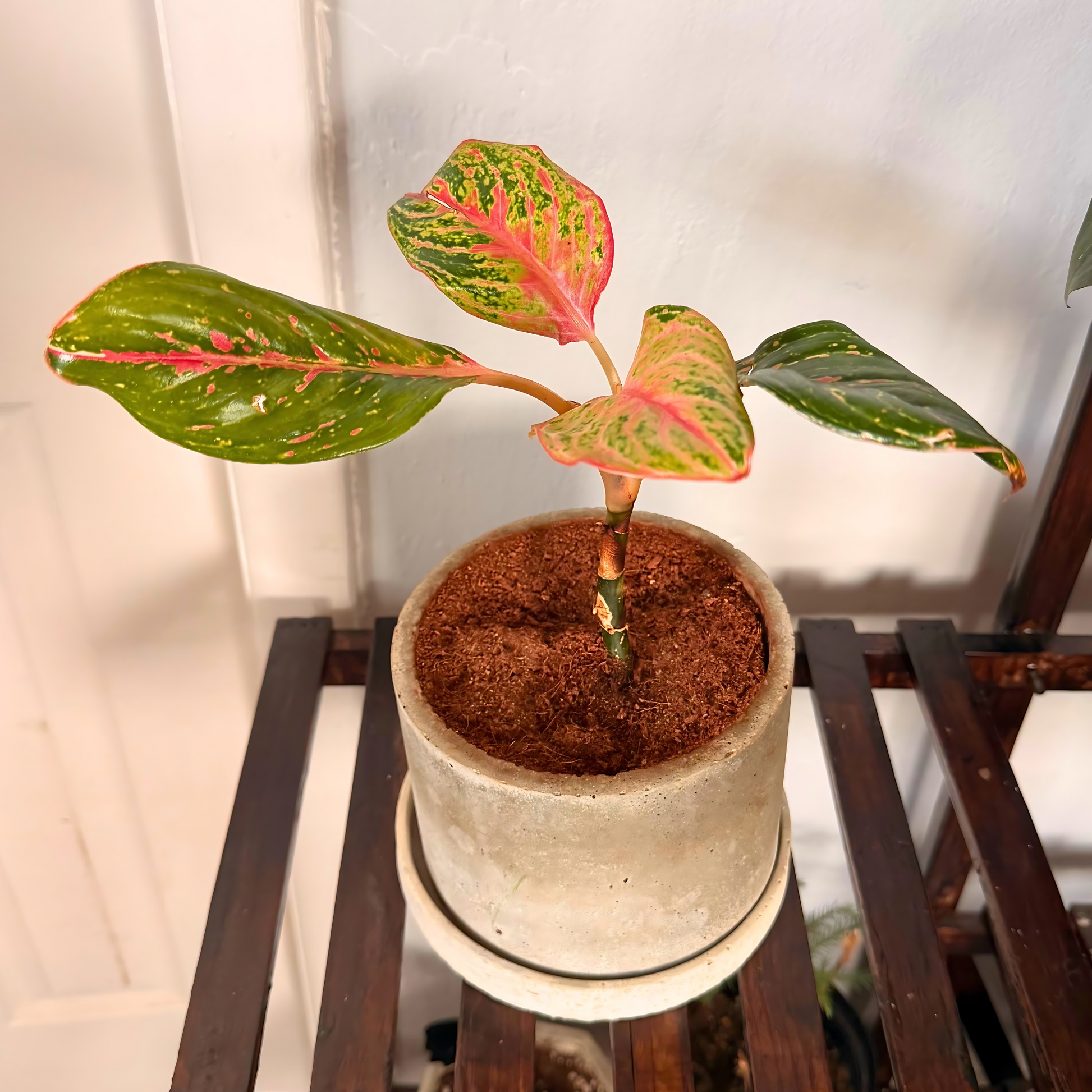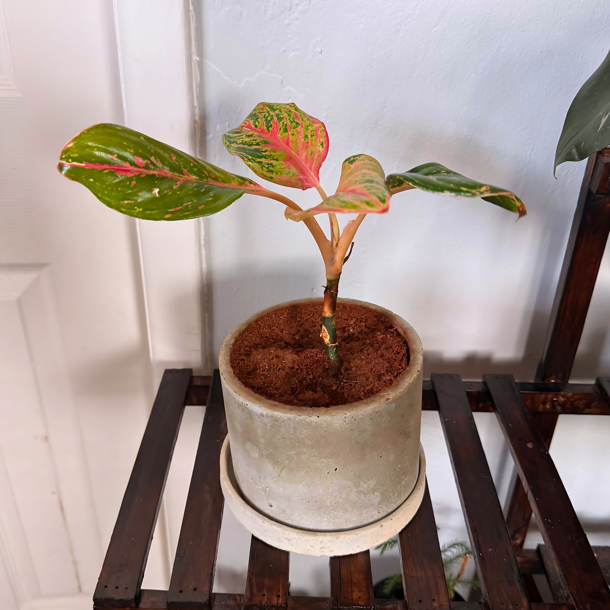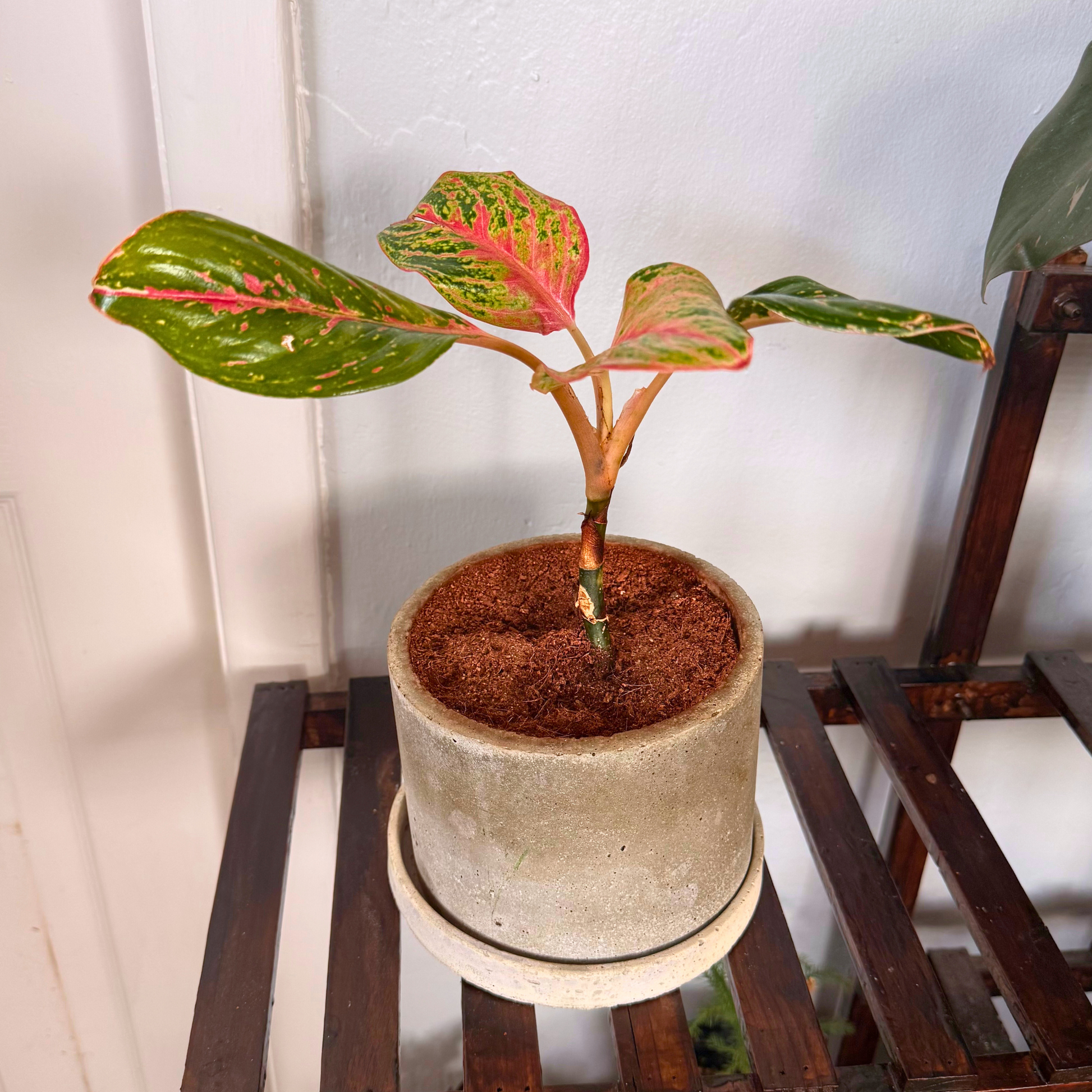 Your Aglaonema comes in our signature Charlie Pot Original – a hand-crafted concrete planter with a minimalist circular design. Each pot includes a matching drainage tray for healthy watering and a modern, elevated look that blends with any décor.
