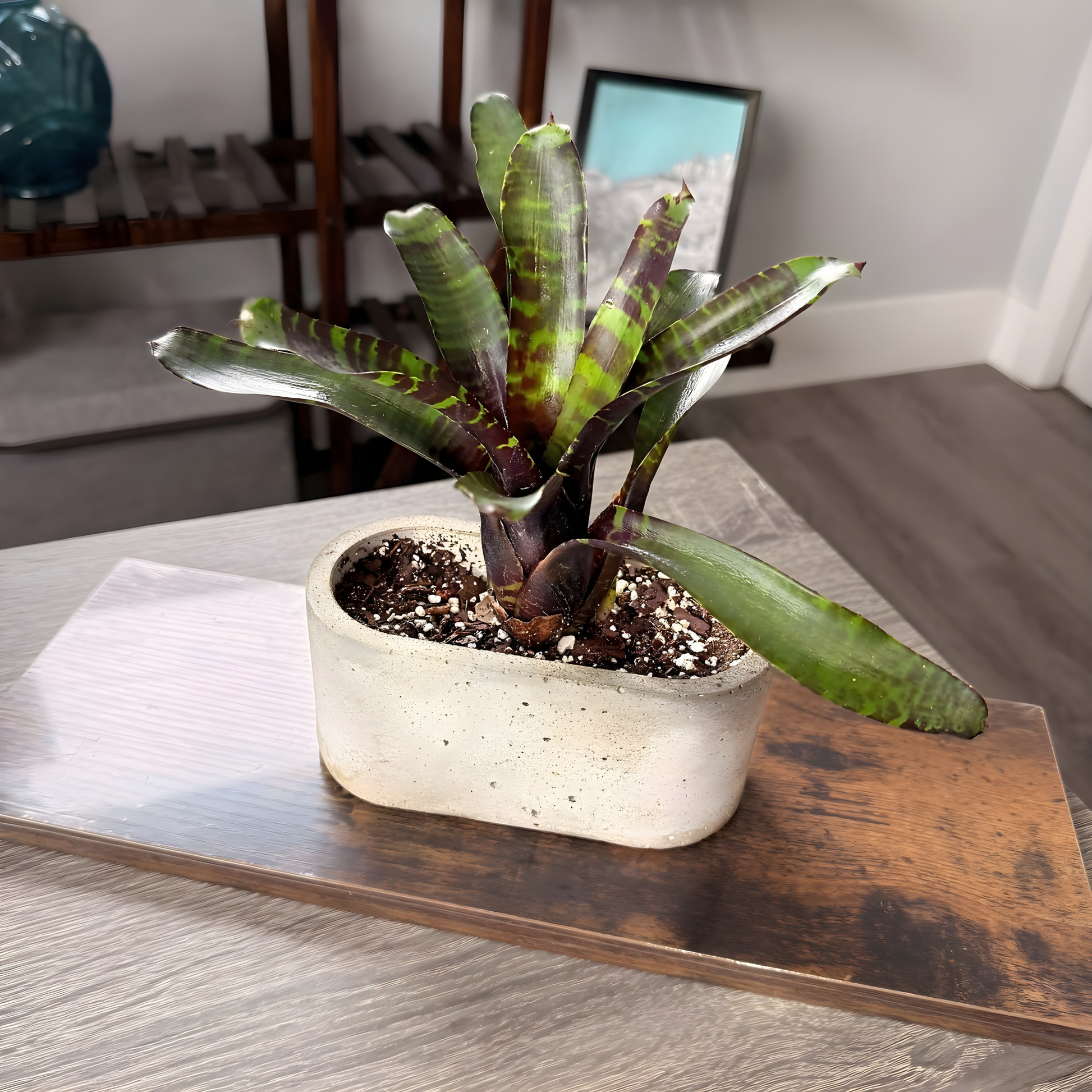 About the Neoregelia 'Blushing Tiger' — This striking bromeliad features green leaves with burgundy banding arranged in a compact rosette. It adds tropical energy and sculptural form to shelves and desks.