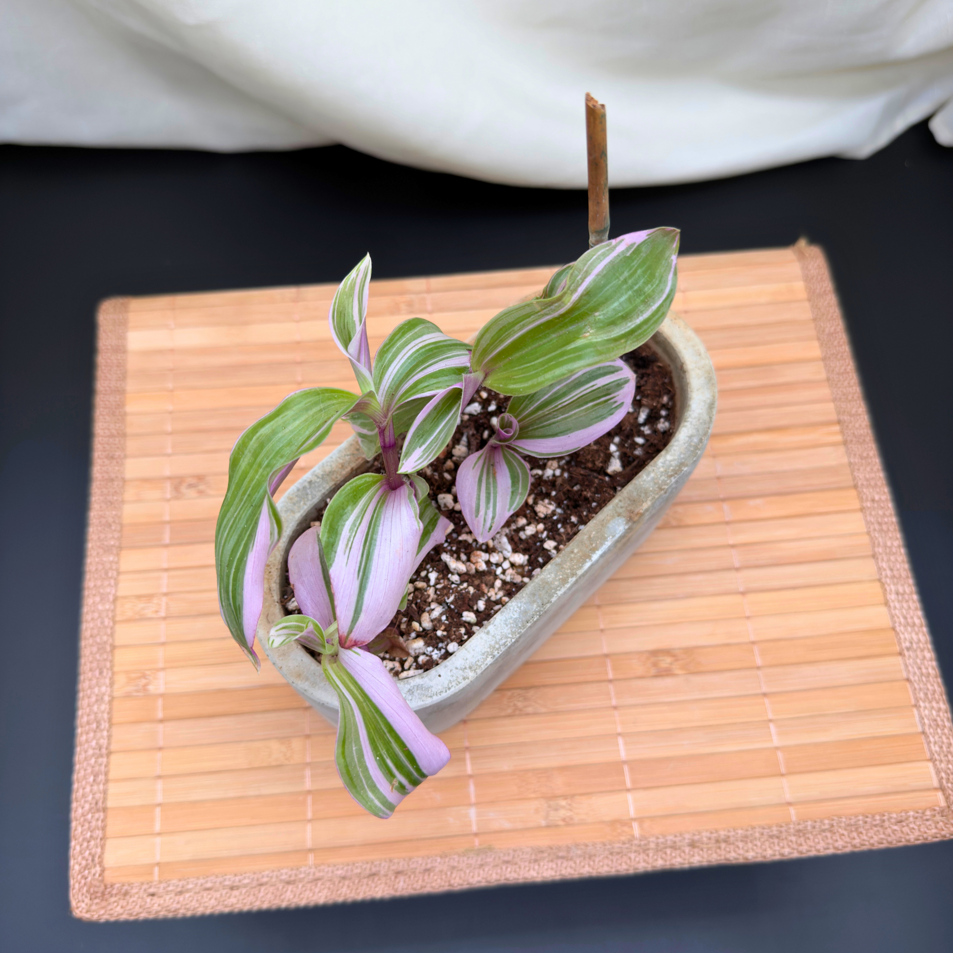 The Tradescantia ‘Lavender’ (Tradescantia fluminensis) is a vibrant trailing houseplant with variegated lavender, silver, and green leaves. Known for its fast-growing nature and cascading habit, it’s perfect for shelves, desks, or hanging spots where its foliage can spill gracefully.